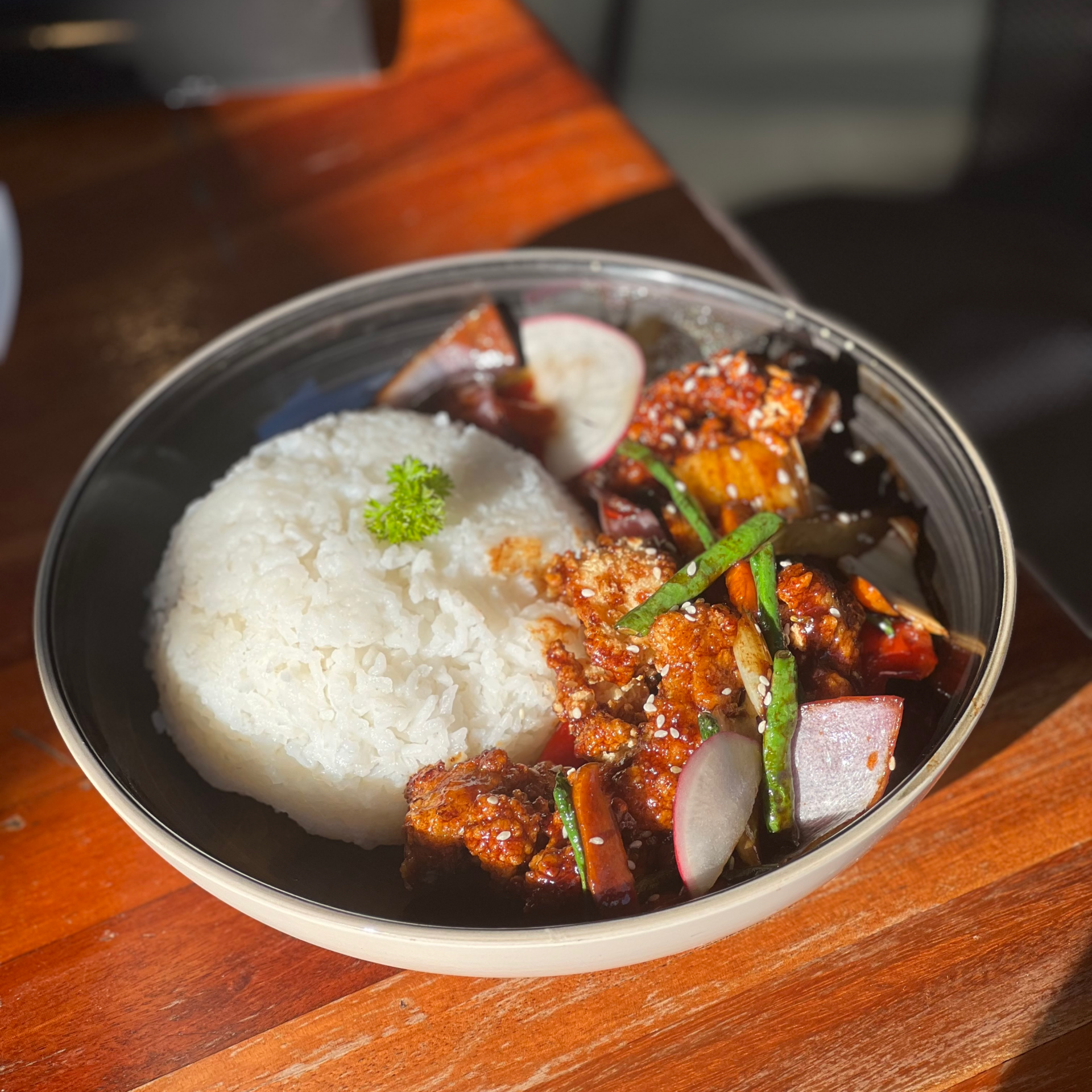 Fried chicken, steamed rice, local vegetables, mongolian sauce